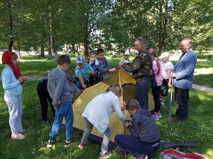 научил ребят правильно собирать палатку и надевать спасательный жилет. Дети